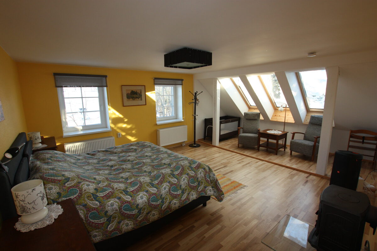 Esimene magamistuba on avar, ligikaudu 40 m² suurune tuba, mis pakub mugavat majutust kuni kuuele inimesele. Toas on kaks kaheinimesevoodit ja kaks üheinimesevoodit. Hubasust ja soojust lisab malmkamin, meelelahutuseks on nutiteler ning valikus on ka mitmesuguseid lauamänge. Suur laud sobib hästi nii ühisteks tegevusteks, mängudeks kui ka töötamiseks. Katuseakendest avaneb kaunis vaade merele, mis loob toas eriti mõnusa atmosfääri.